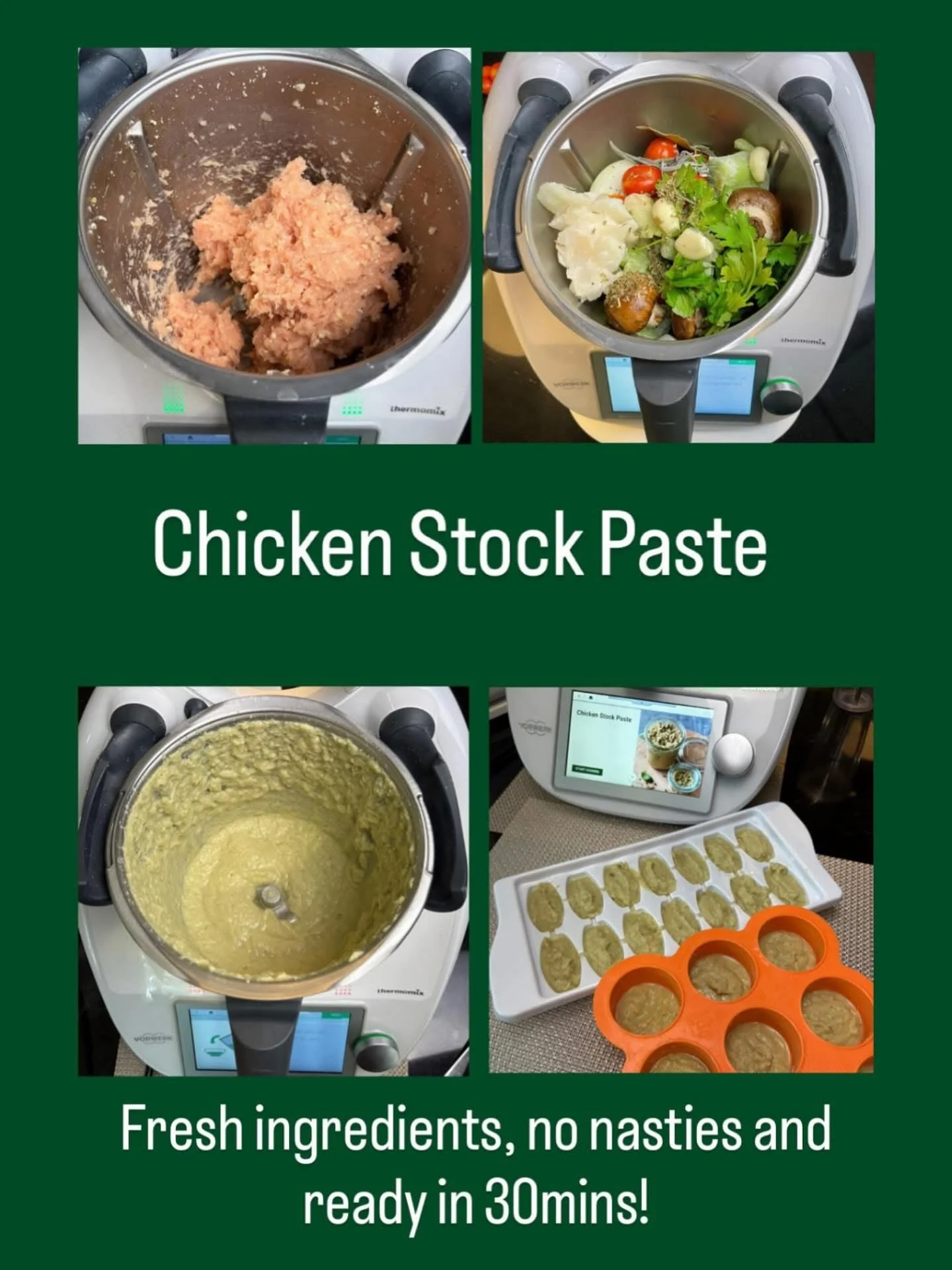 What do I use it in? Soups, stews, pastas, risottos, sauces… you name it. I usually reduce the salt content and freeze it in ice cube trays (each cube = approx. 1 tbsp). It’s a great way to use up veggie scraps too, think broccoli stalks, carrot tops, or that half zucchini hiding in your fridge. I follow the Cookidoo® recipe as a base and mix in whatever extras I have on hand. Once you try making your own, you’ll never go back to store-bought again! Your Thermomix does it all: grinds the chicken, chops, cooks, blends and it’s all done in one bowl in under 30 minutes.
